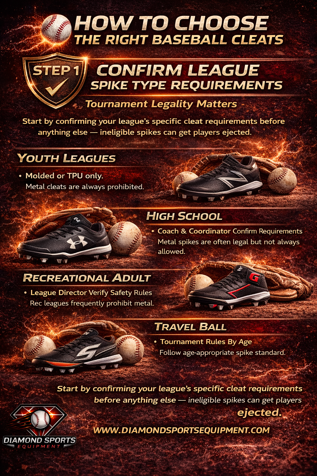 This is the only non-negotiable first step in cleat selection — and the one most frequently skipped. Every organized baseball league has specific cleat requirements that determine which spike configurations are permitted for competition. Using the wrong spike type creates equipment violations that force mid-season replacement purchases and can result in player ejection on game day.