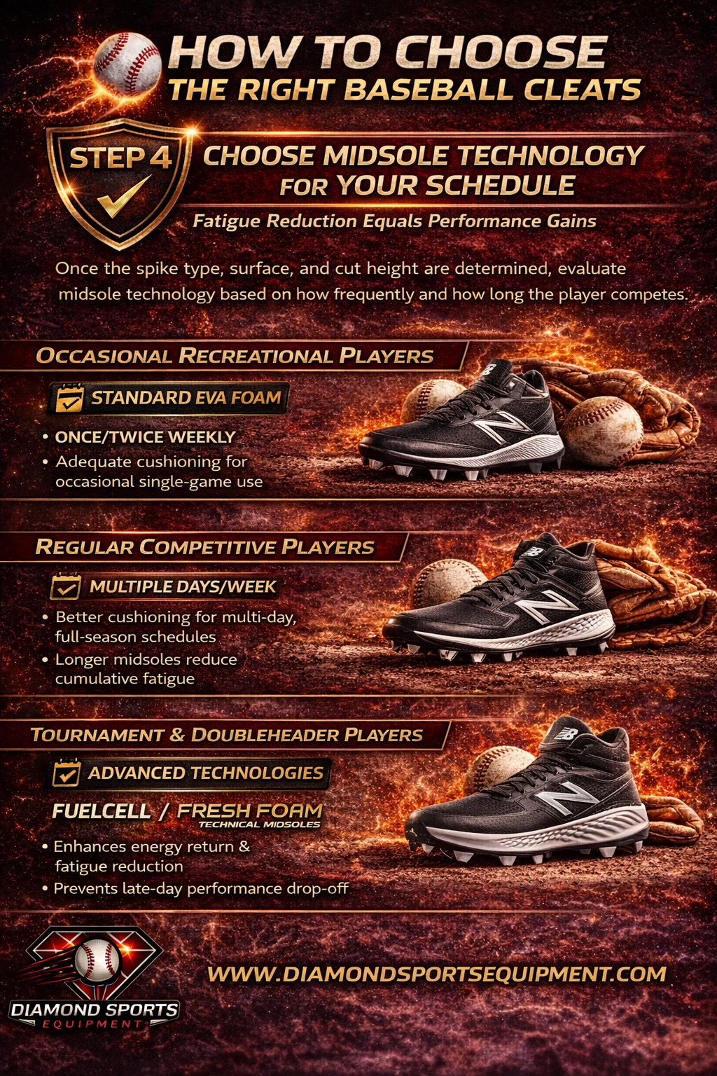 Tournament and doubleheader players — advanced midsole technologies like New Balance's FuelCell or Fresh Foam provide energy return on every footstrike that reduces fatigue accumulation meaningfully across full tournament days. The investment pays off most clearly in the final innings of the second game of a doubleheader when standard EVA fatigue has accumulated to the point of affecting movement quality.