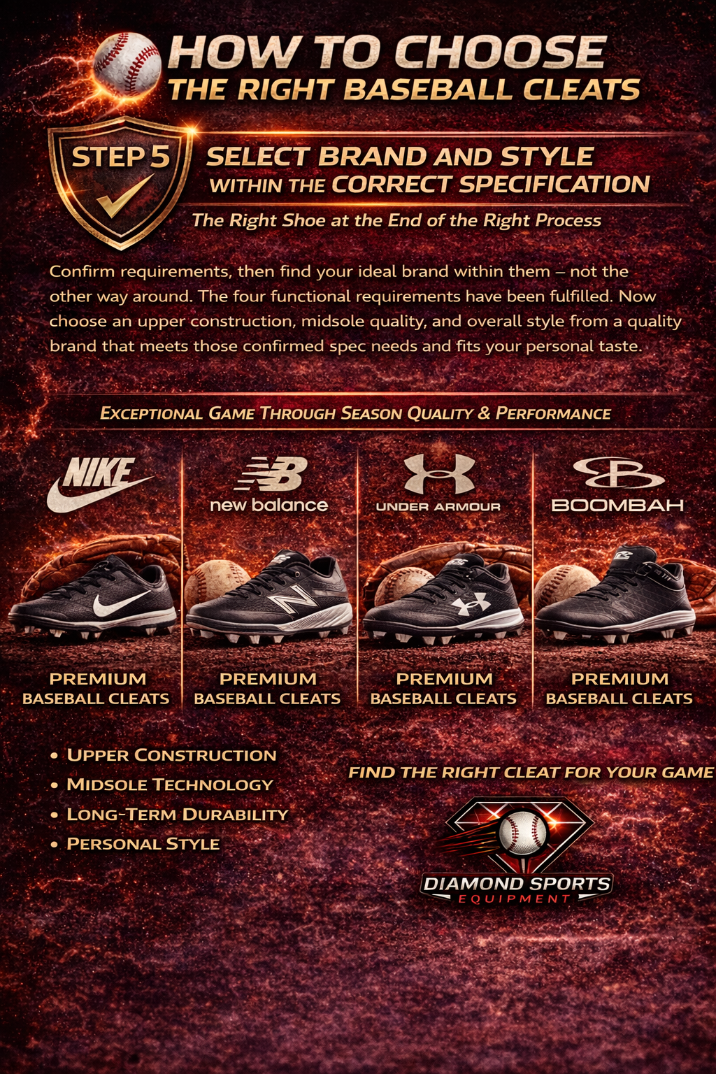 Within any correctly specified configuration, brand differences matter in terms of upper construction quality, midsole compound performance, and long-term durability through regular competitive use. Premium constructions from New Balance, Nike, Under Armour, and Boombah all deliver meaningfully different performance experiences within the same general cleat category — evaluating specific options within the correct specification produces a better outcome than defaulting to brand loyalty before specification is confirmed.