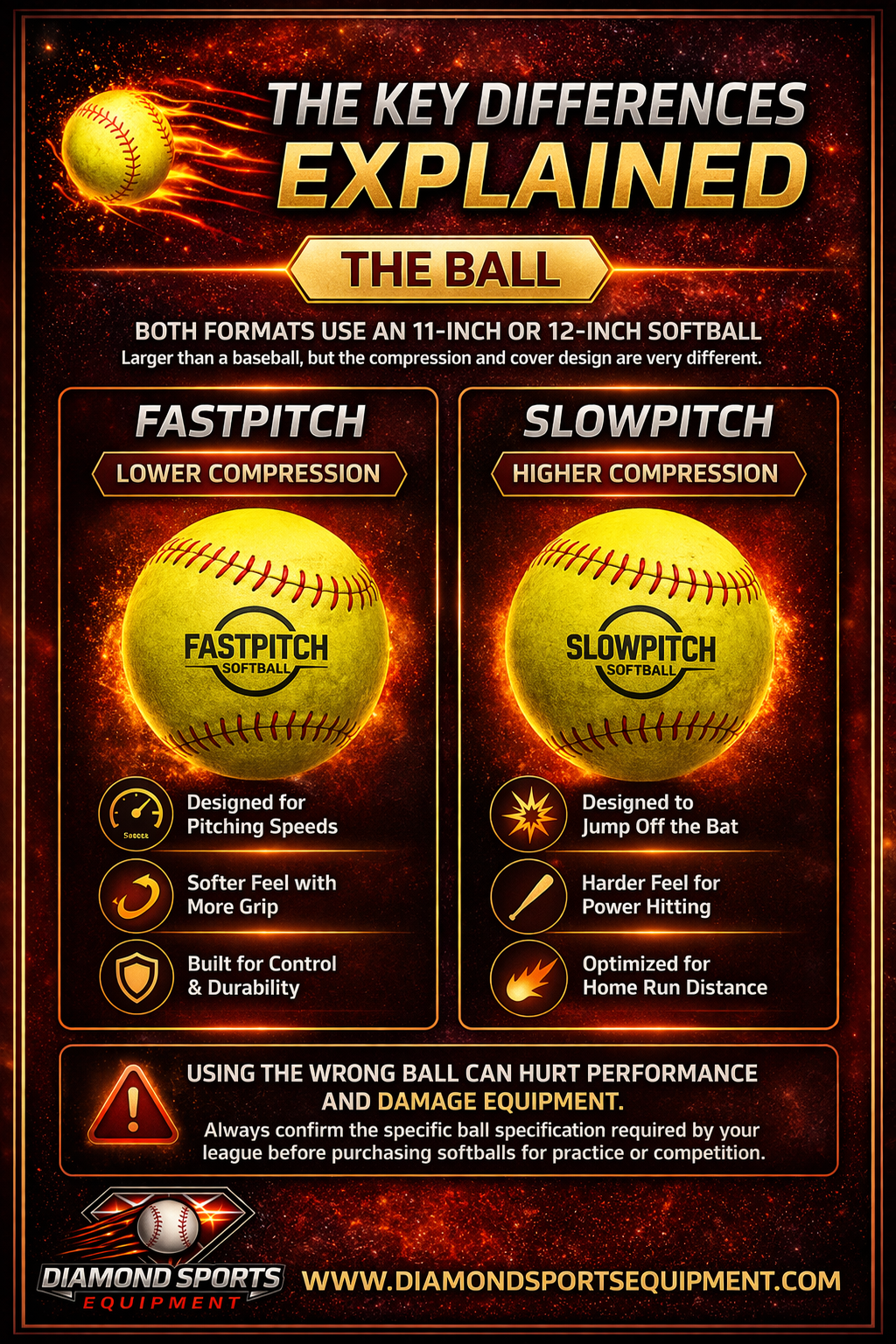 Both fastpitch and slowpitch use an 11-inch or 12-inch softball — larger than a baseball in both cases. However the compression and cover characteristics of fastpitch and slowpitch softballs differ significantly. Slowpitch softballs use higher compression specifications that are designed to jump off a composite bat barrel on contact — generating the home run distances that competitive slowpitch offense celebrates. Fastpitch softballs use lower compression specifications appropriate for the pitching speeds and contact velocities of competitive fastpitch play.